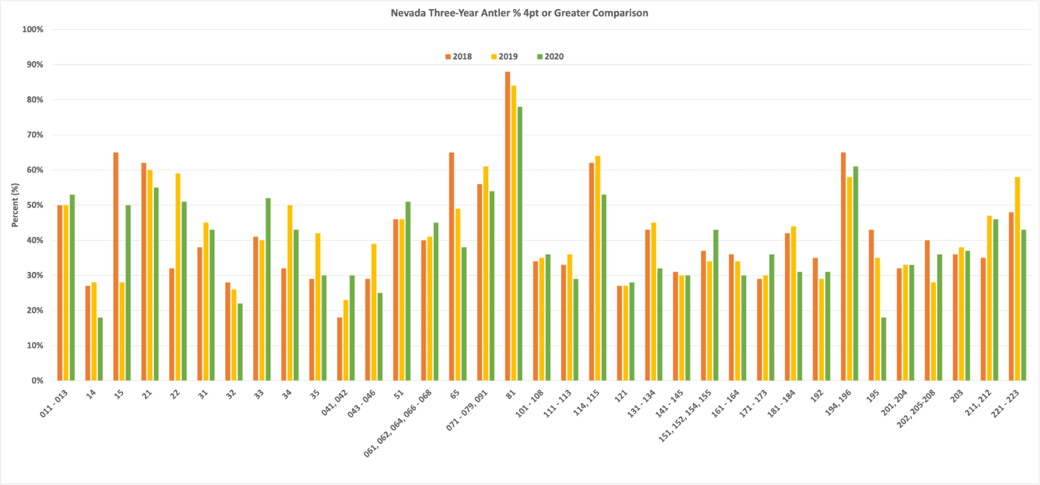 In 2019, 45% of the deer harvested in Nevada were 4 points or better, an increase of 3% over 2018. How did 2020 fare? Well, we will have that updated in TagHub as soon as the State releases their data. My expectation is that we will see a par for the course year but the 2021 season may see a slight drop off due to the drought.