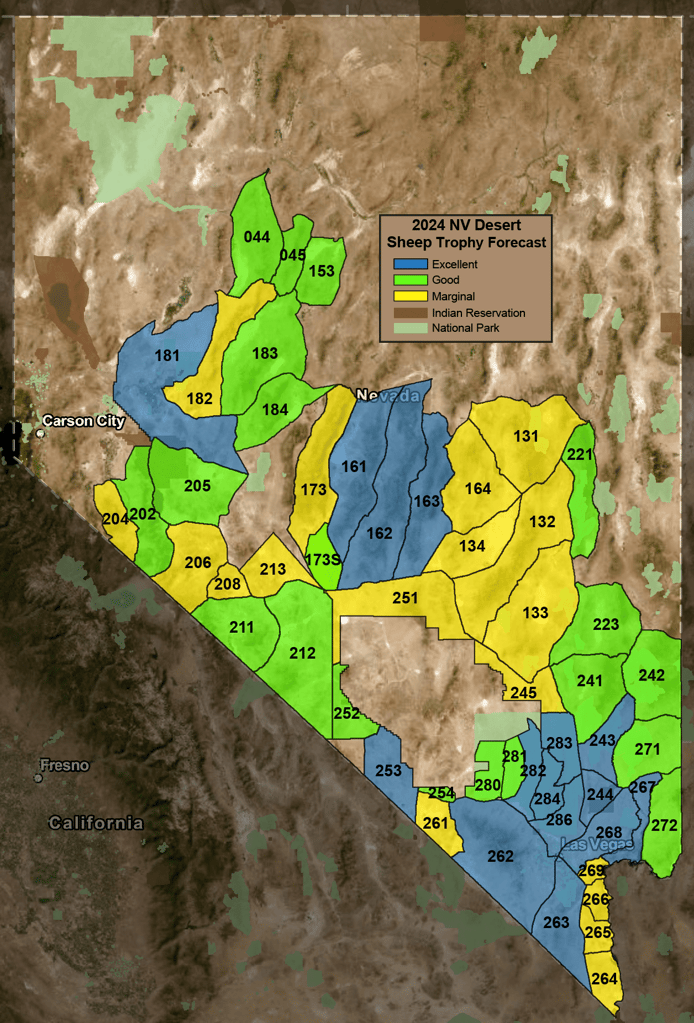 NDOW recommended 193 desert ram tags across all weapon types for the 2024 season compared to 230 tags approved by the Wildlife Commission. That is a 16% cut in tag numbers when compared to 2023. Be paying attention to quotas as those will be released later this spring for 2025.