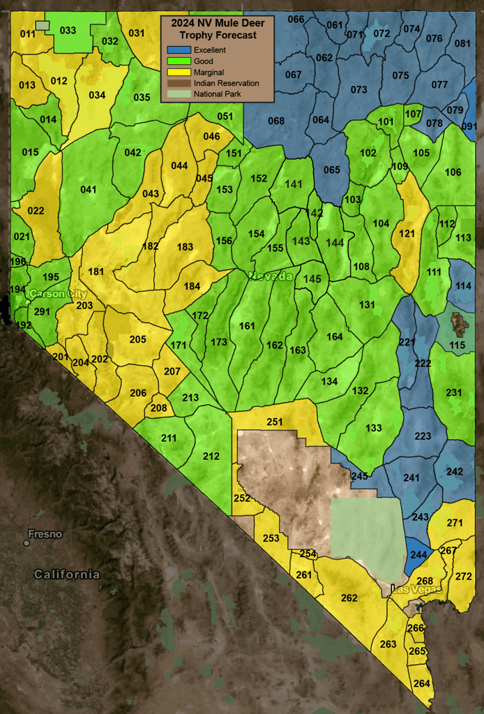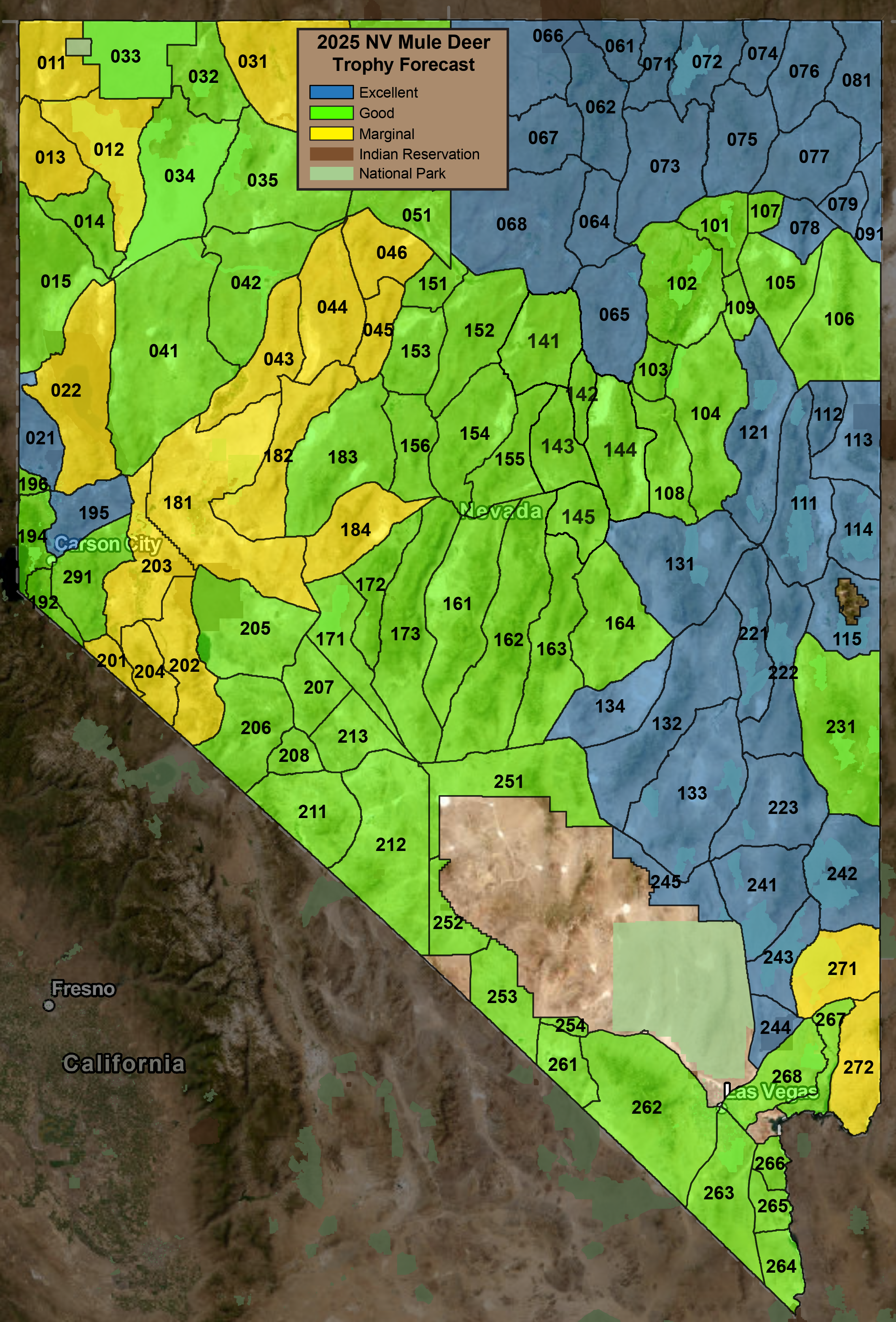 What will hunting mule deer look like in Nevada for 2025? Populations may be down but it is always the strongest that survive. That said, I would call hunting mule deer in Nevada a very mixed bag. The drought throughout much of the eastern portion of the State and heading southwest across the State will make antler growth tough in many areas. I would be looking at the northern Blue and Green-Chip units to burn my points. That will be where as of right now, the best circumstances will be for antler growth; outside of that it might be worth waiting a year.