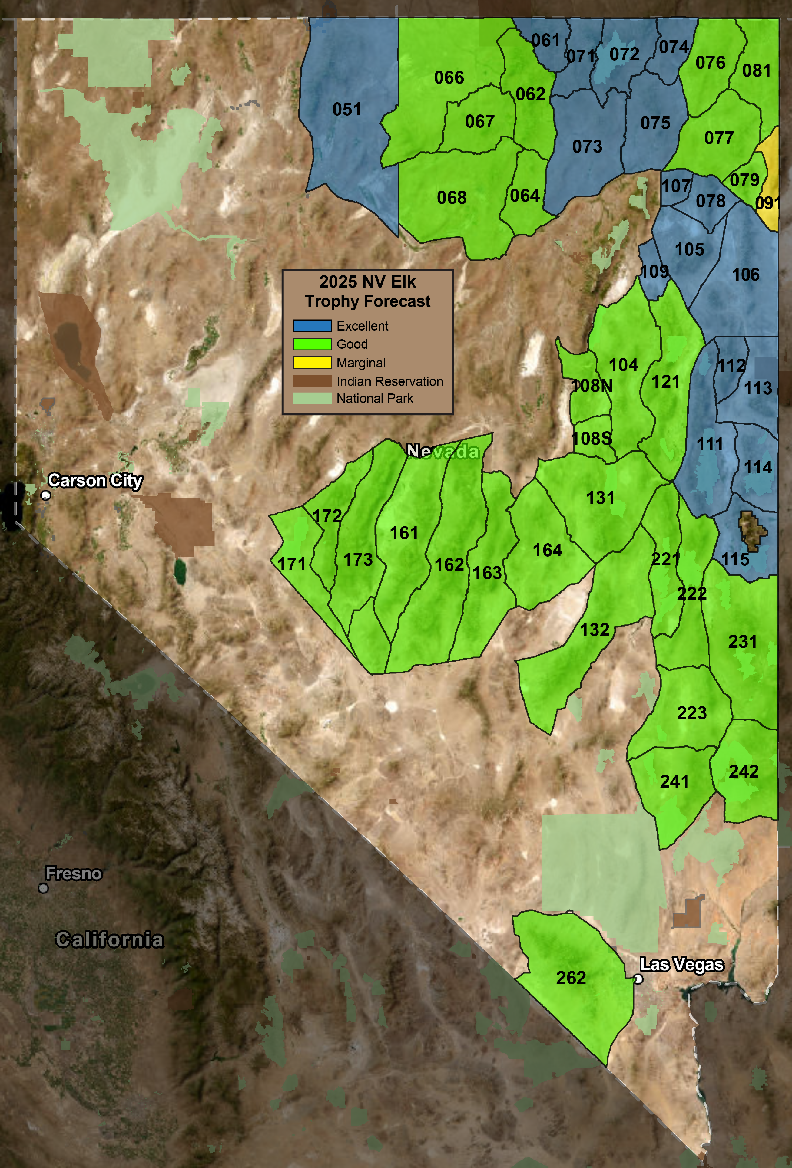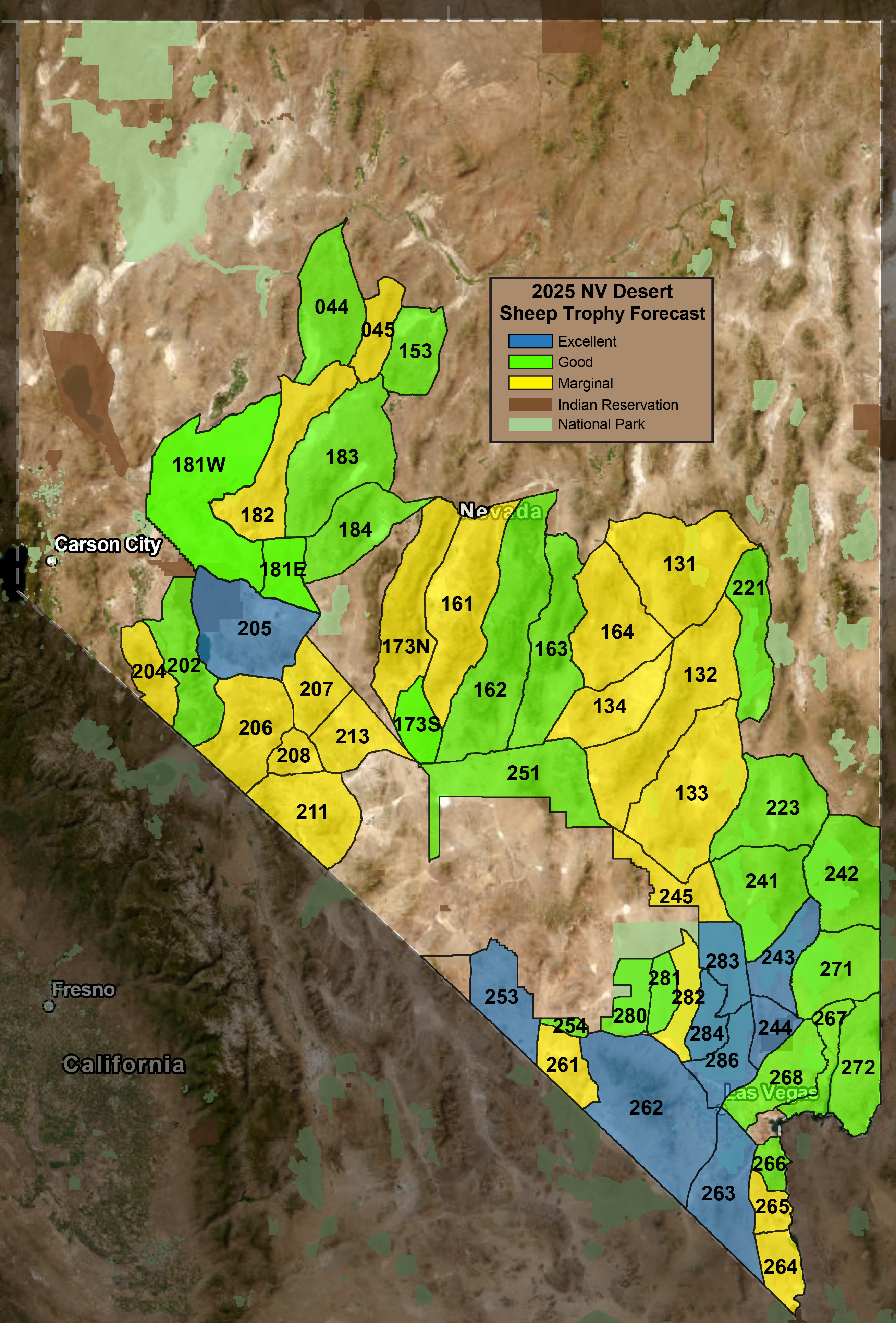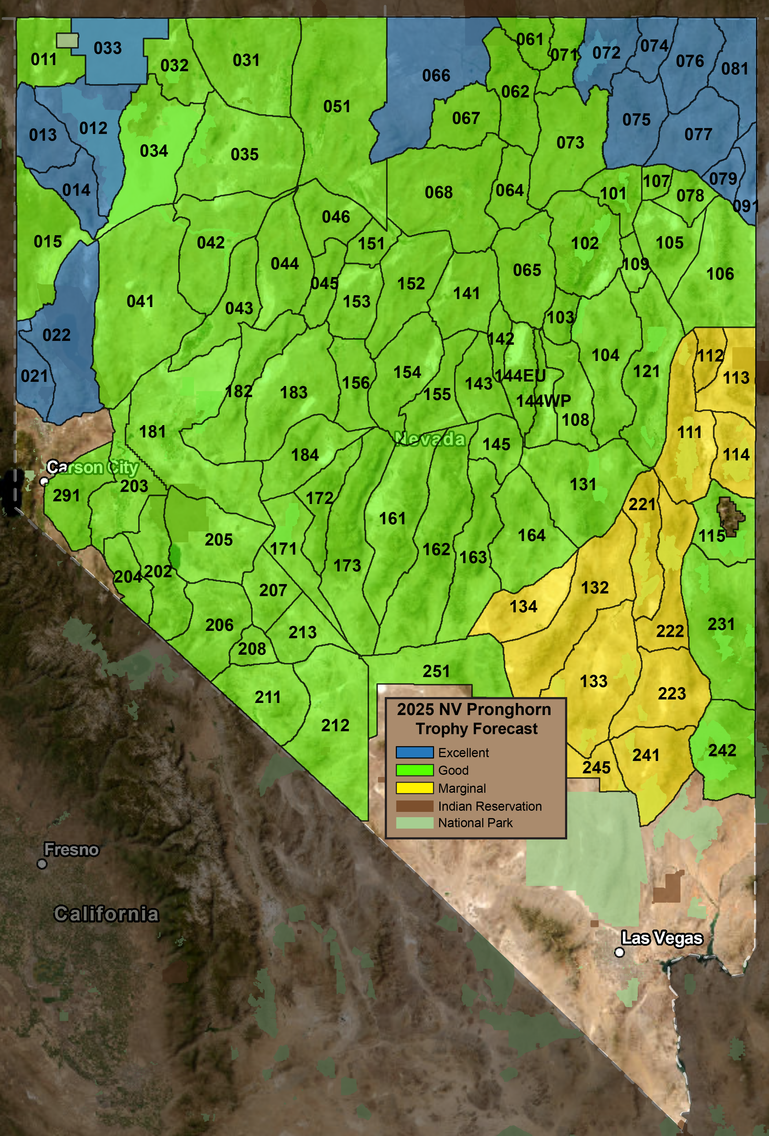 Nevada’s price structure looks the same for 2025. Residents will pay $38 for a license and nonresidents will pay $155. Make sure you take a look at the other assorted fees that are associated with applying, such as the $1 processing fee, the $3 predator fee, per application and the $10 application fee. These are the little fees that can add up quickly. Be prepared and take a look at the chart on this page to make sure you know the prices for the tags themselves if you are one of the lucky ones to draw.