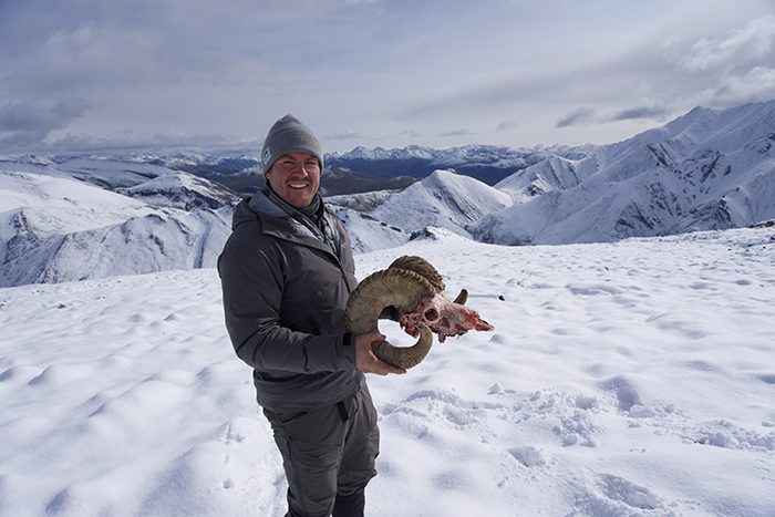 Prior to creeping over the roll of the hill, I thought about how this moment could be the moment we had been working for and how it could come together, right here, right now. Moving along a sheer side hill, we slowly inched into a lull, where three sublegal rams were visible. Each ram was between a quarter and half curl. We were positioned slightly below, but within range of an ethical shot of the three spotted sheep. We started to grow anxious, wondering where the other two rams were. We contemplated moving higher up the mountain to get a better vantage; however, we determined that patience was key in our circumstance. A few minutes later, Ryan softly, but emphatically, told Chase to get to the spotter. A fourth ram was cresting the hill and moving towards the other sheep. Chase immediately declared the ram was legal based on the shape of the right horn reaching full curl. This was evident once I was able to view the ram through my scope. As the ram worked along the face, Ryan whispered to me the key shooting techniques – wait until he is broadside, do not shoot until you’re steady, and be ready to shoot again. The ram stopped broadside. I was steadying my scope and managing the immense excitement. I didn’t shoot. I wasn’t ready. Internally, I could hear my brothers question why I did not shoot. The ram began moving once again. After a few steps, another broadside opportunity. I took a deep breath, with a pounding heart, and pulled the trigger. Hit! I worked to find the sheep in the scope and heard Chase announce, “You got him, but shoot again”. One more quick shot and the ram was down.